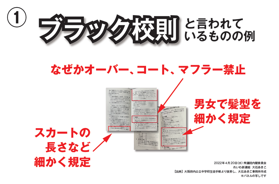 髪の毛も、男女で髪型を細かく規定しています。男子、髪が目、耳、襟にかぶさる長髪は禁止だと。男の子だから長髪禁止って、いきなりおかしいんじゃないですか。ツーブロック、ソフトモヒカン、アシンメトリー、トップ、サイドの長さが著しく異なる髪は禁止。女子も、長い髪は縛ったり、何々禁止禁止ということで、一歩歩けば禁止禁止と、このように縛りつけるような校則になっていまして、これは何の罰ゲームなのかと。