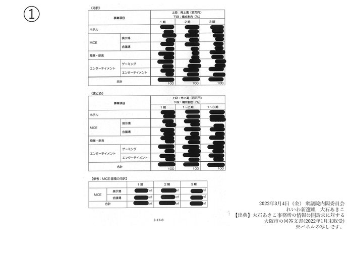これです。これは、夢洲まちづくり構想のときのカジノの、IRの経済波及効果、一兆円程度あるということなので、その根拠となる基データを情報公開請求したものですが、このように黒塗り、非公開でした。えっ、質問時間が終了。