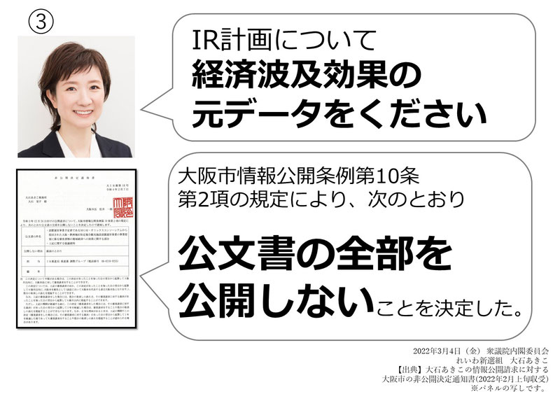 ほかにも、直近のIR計画、これはコロナ後のものですけれども、同じように経済波及効果の基データを求めたところ、全部を公開しないということでした。これらの状況で、住民の十分な合意形成と言えるわけがないですよね。