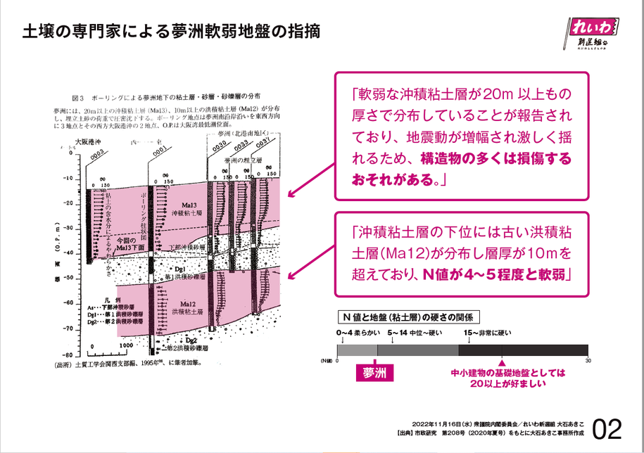 このN値というのは地盤の固さをいうんですけれども、夢洲は4、軟らかい。