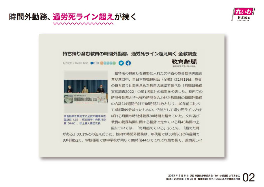 大石 今の小中学校の先生の平均の残業時間、過労死ラインの月80時間を超えた状態です。