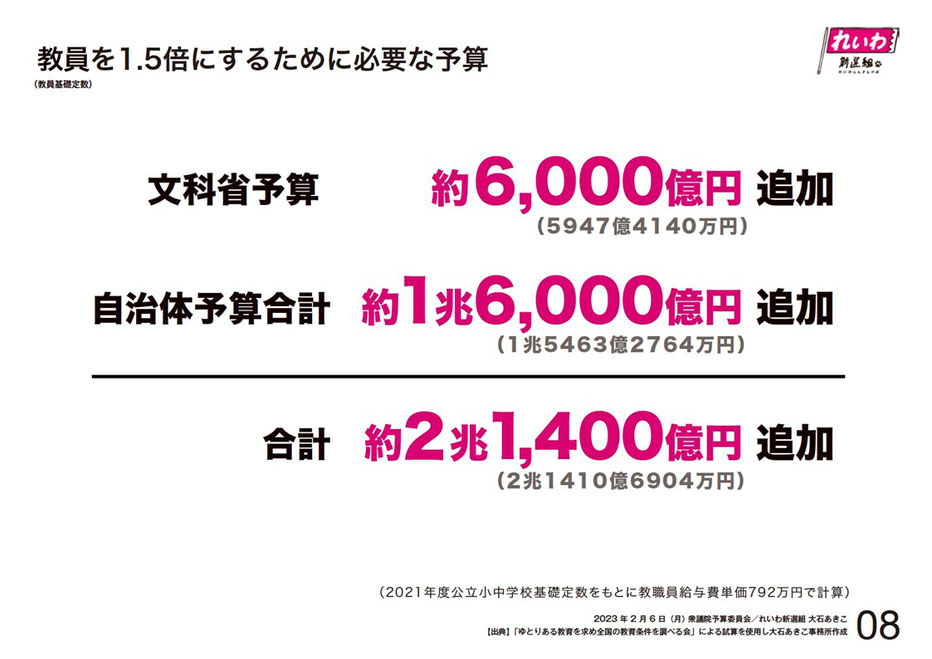 資料8です。教員を1.5倍にするために必要な予算、これは計、年間約2兆1400億円の追加となります。
