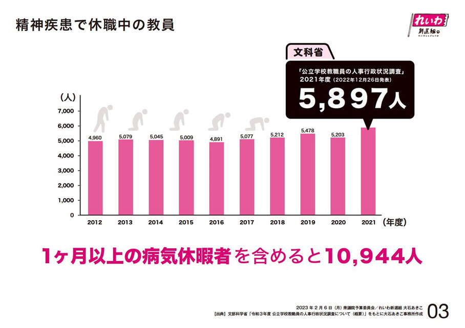 大石 精神疾患で休職中の教員、2021年度には5897人、1か月以上の病気休暇者を含めると10944人です。