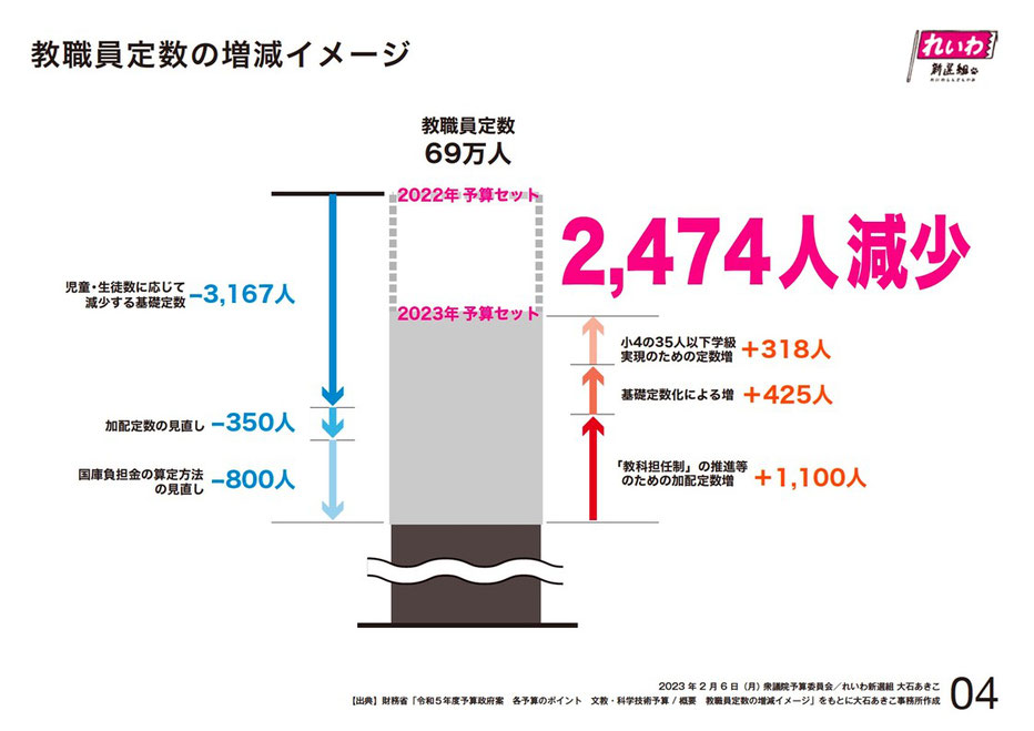 4月からは2474人相当の教育予算が更に減らされる。これは、教科担任制で教員を増やしたんだなど、