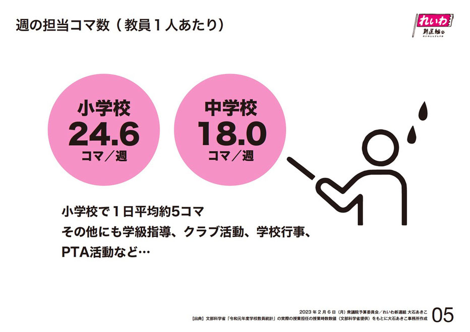 小学校で週24.6コマ、これは、1年平均で、約5コマ、日で平均で5時間も授業をしているということです。