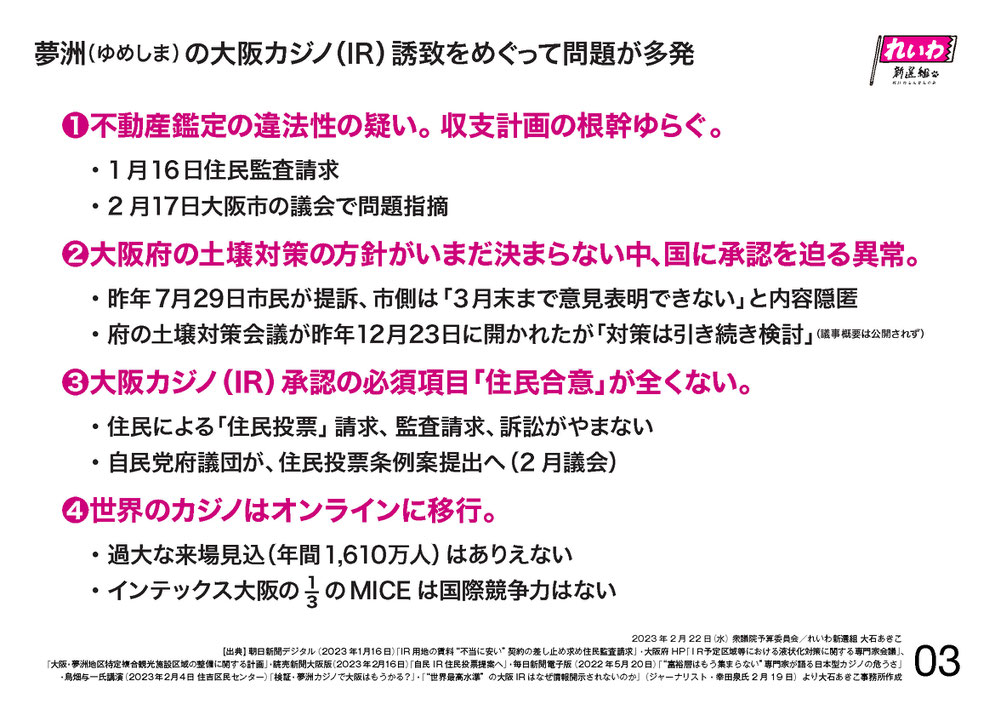 夢洲の大阪カジノ誘致をめぐって問題が多発しています。4つにまとめました。