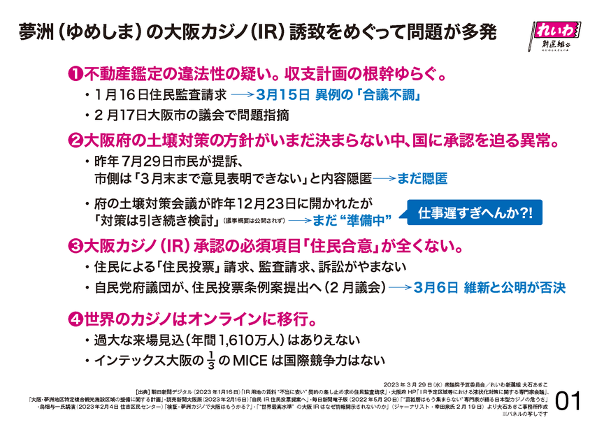 IR、カジノ問題についてです。先月、2月22日の予算委員会で、パネルで4つの問題をお示しして、