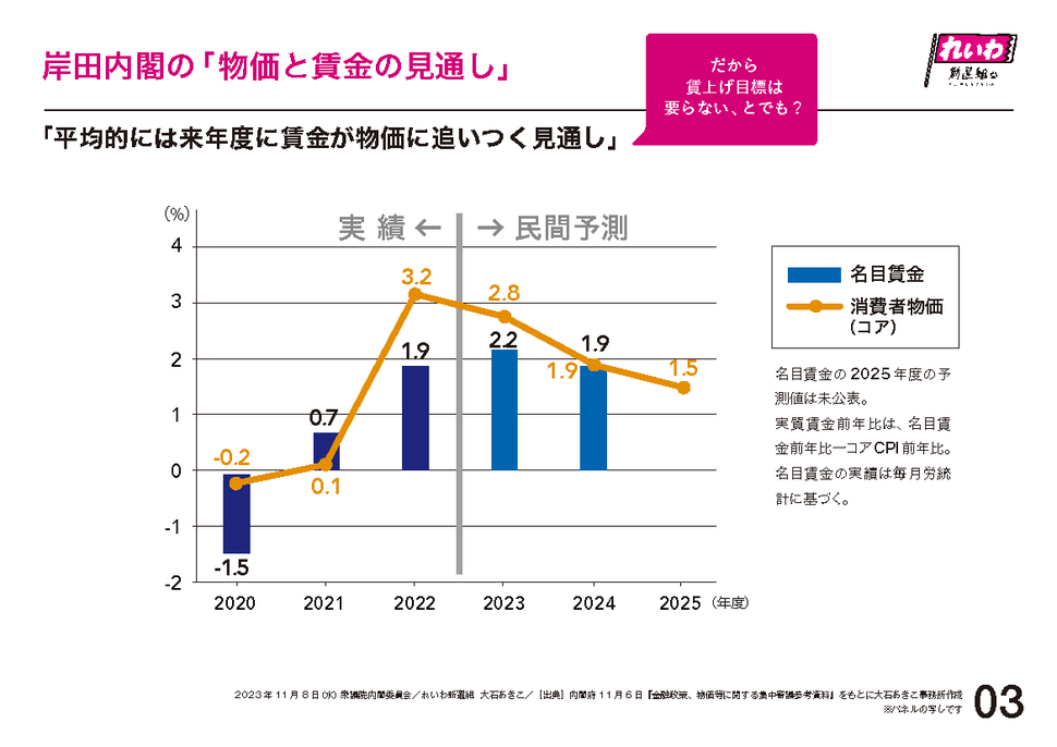 けれども、これは、11月6日の「金融政策、物価等に関する集中審議」参考資料です。来年度追いつく見通しだと新藤大臣もおっしゃったので、それを裏づける資料はこちらと。「岸田内閣の「物価と賃金の見通し」」という資料が、こちらなんです。