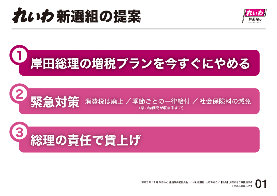 まず、国民の負担が多過ぎるのを認めるのであれば、このように、何より1ですね、岸田総理の増税プランを今すぐにやめてください。防衛増税を始めとする増税プランを撤回するべきです。そして、しょぼい所得税減税のごまかしではなくて、このような緊急対策、必要なことをやっていただきたいんです。消費税は廃止、季節ごとの一律の給付金、そして社会保険料の減免です。そして、総理の責任で賃上げを行わなきゃ駄目なんです。