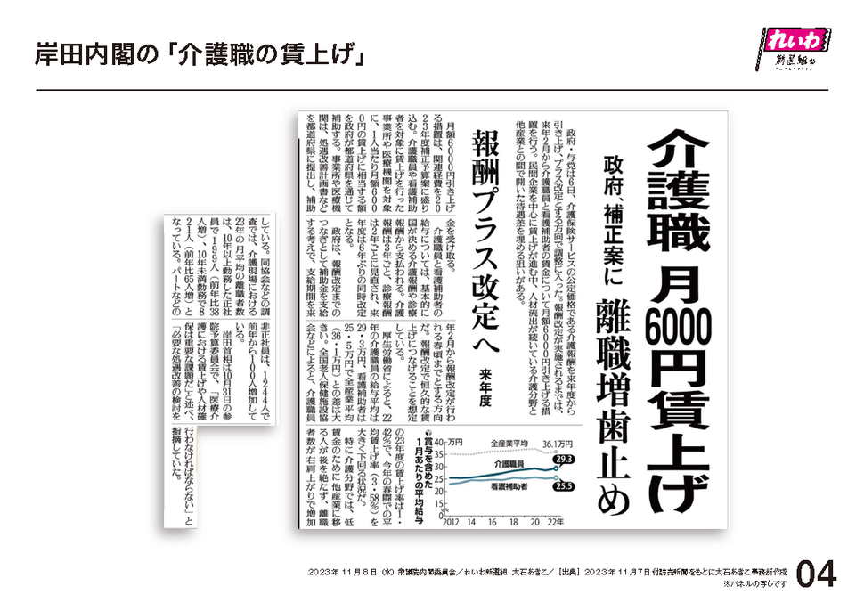 「岸田内閣の「介護職の賃上げ」」。これが、10月に二転三転した上で、昨日、やはり月6,000円の賃上げですとなっているんですね。よろしいですか、SNSを見てくださいね。1桁足らん、介護職なめてんの、ゼロが1個足りねえだろう、こんな額で離職に歯止めがかかると思っているのか、日給で6,000円アップの間違いか、10万にしろの声。それから、ケアマネは放置かなど、声があふれているんですけれども、届いていますでしょうか。その意味、分かっていますでしょうか。