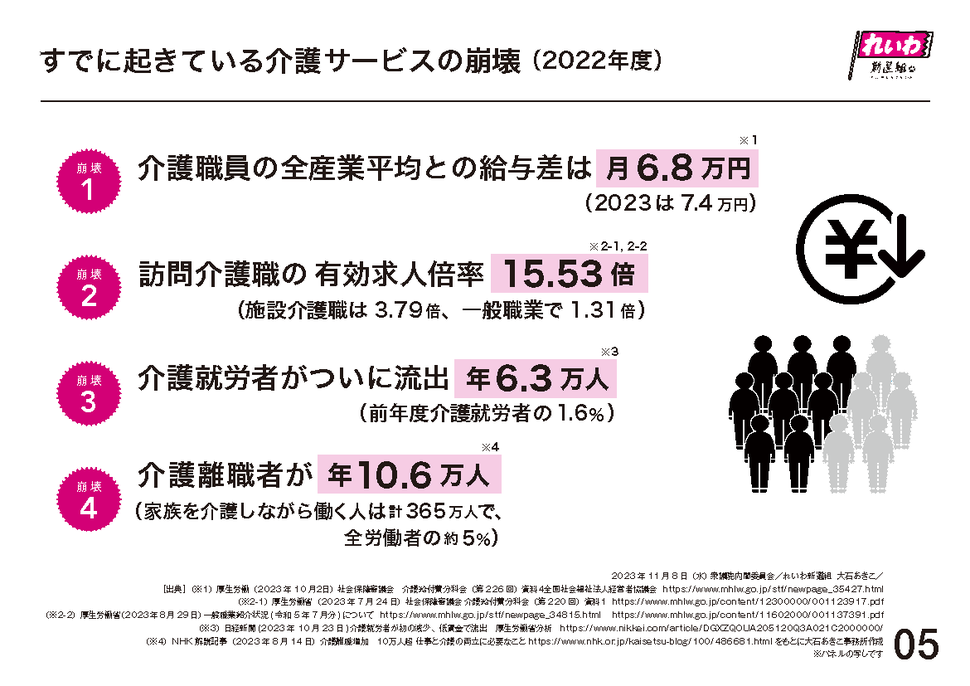 パネル5を御覧ください。全て厚労省の資料です。「すでに起きている介護サービスの崩壊」、2022年度の数字です。まず、この崩壊1が原因で、崩壊2から4まで起こっているんです。介護職員の全産業平均との給与差、月6.8万円、直近では7.4万円に拡大するとの試算です。これによって介護職がすごいことになっている。