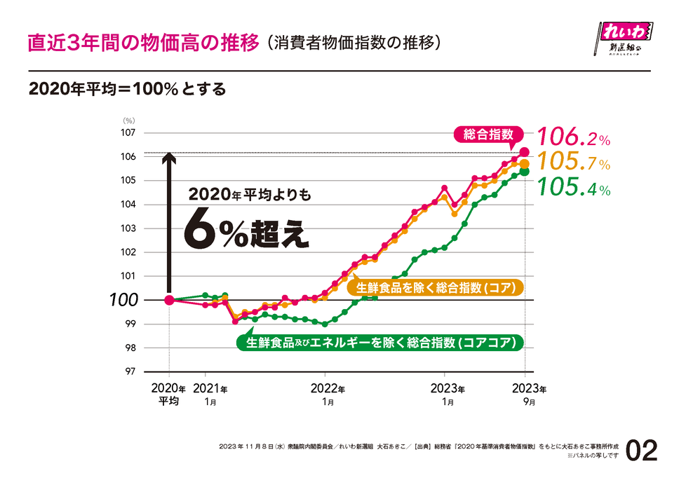 これは、「直近3年間の物価高の推移」。2020年を平均、100%として、毎月の、そして直近の2023年9月までの物価が何%上がったかを示すグラフです。2022年以降、コスト高による悪い物価高が襲いかかって、現在、物価は2020年平均よりも6%を超えて上昇しています。この物価高を超える、すなわちこのグラフを超える賃上げがなされない限りは実質的に賃金は目減りする、つまり暮らしは悪くなるというわけです。実際に、その実質賃金が18か月連続下がっている。多くの国民が食費を切り詰めるまで生活しているんですね。先ほど、消費が弱含みになっているとおっしゃっていましたけれども、まさにそうで、そうしたら消費税減税をやらなきゃいけないんですね。