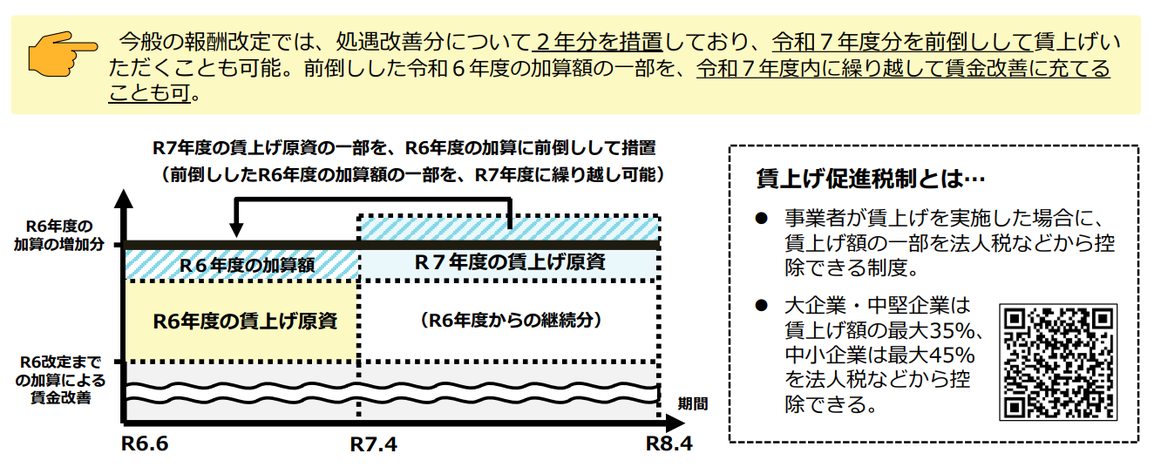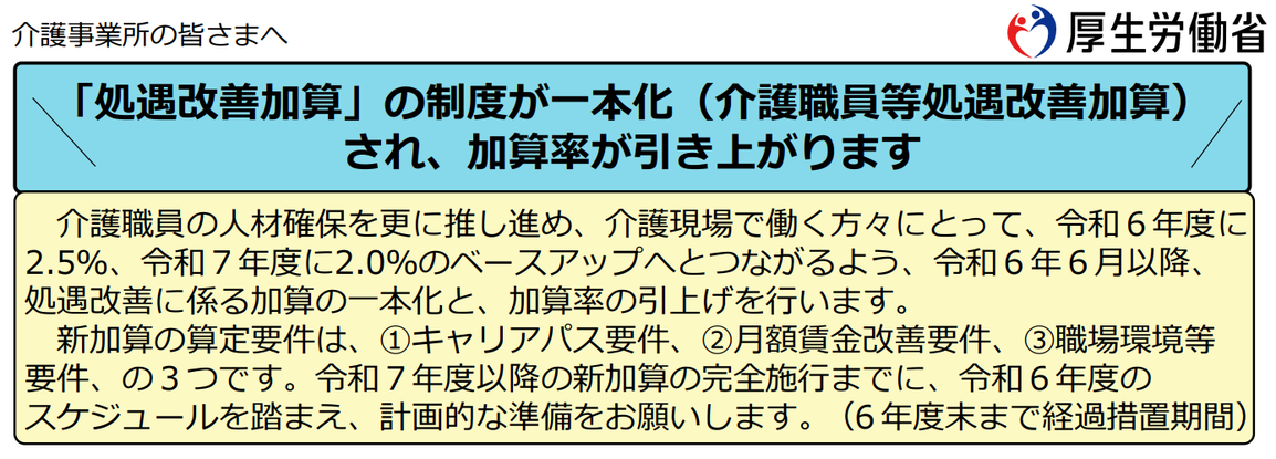 政府は、「訪問介護については、処遇改善加算について、今回の改定で高い加算率としており、賃金体系等の整備、一定の月額賃金配分等により、まずは14.5%から、経験技能のある職員等の配置による最大24.5%まで、取得できるように設定している」とし、さらに、「介護現場で働く方々にとって、令和六年度に2.5%、令和七年度に2.0%のベースアップへと確実につながるよう加算率の引上げを行う。」と説明している(2024年1月22日第239回社会保障審議会介護給付費分科会資料)。