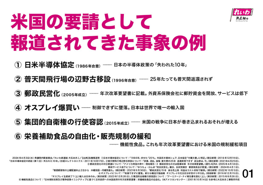 郵政民営化。これも、日本の郵便局、郵政のことじゃないのかと。そうではなくて、アメリカの年次改革要望書に記載されています。