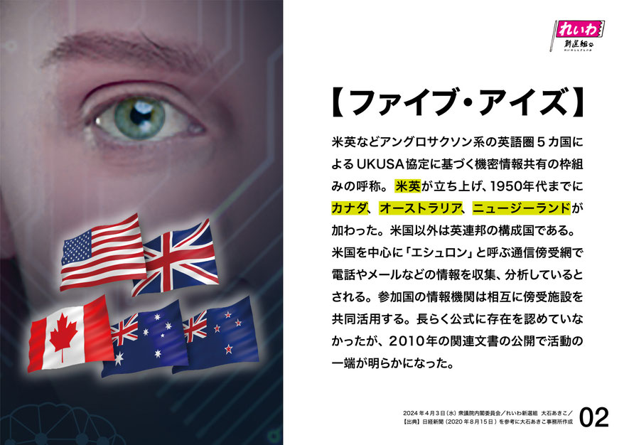 大石 この委員会でもたくさんファイブアイズについて言及されてきました。ファイブアイズとは、五つの目を意味するファイブアイズ、アメリカ、イギリス、カナダ、オーストラリア、ニュージーランドの五か国だけが共有する秘密情報ネットワークです。