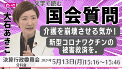 国会報告2024年5月13日【大石あきこ・決算行政監視委員会分科会】介護を崩壊させる気か!/新型コロナワクチンの被害救済を 2024年5月13日【決算行政監視委員会】で、武見厚生労働大臣に質問しました。====井坂主査 次に、大石あきこ君。大石 れいわ新選組、大石あきこです。本日は、介護の報酬改定と新型コロナワクチン健康被害救済について伺います。まず、介護の報酬... 2024.05.13国会報告決算行政監視委員会