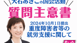 国会報告2024年10月1日【大石あきこ・質問主意書】重度障害者等の就労支援に関して こんにちは、大石あきこです。本日、10月1日、臨時国会が始まりました。用意してきた質問主意書を3本出しました(2本目)。第214回国会 3 重度障害者等の就労支援に関する質問主意書 (shugiin.go.jp)質問主意書とは、国会の会期中... 2024.10.01国会報告質問主意書