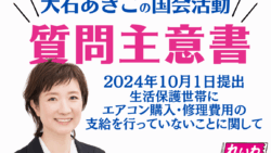 国会報告2024年10月1日【大石あきこ・質問主意書】政府がすべての生活保護世帯にエアコン購入・修理費用の支給を行っていないことに関して こんにちは、大石あきこです。本日、10月1日、臨時国会が始まりました。用意してきた質問主意書を出しました。第214回国会 2 政府がすべての生活保護世帯にエアコン購入・修理費用の支給を行っていないことに関する質問主意書 (shugiin.g... 2024.10.01国会報告質問主意書