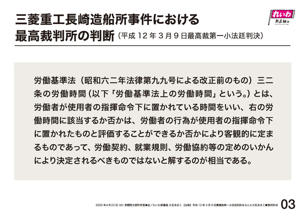 資料3ですが、といいましても、この労基法32条というのが往々にして破られるものですから、様々な裁判を労働者が起こしたり、それを厚労省がガイドラインに追加したりしているところの重要な判例が、03の資料です。