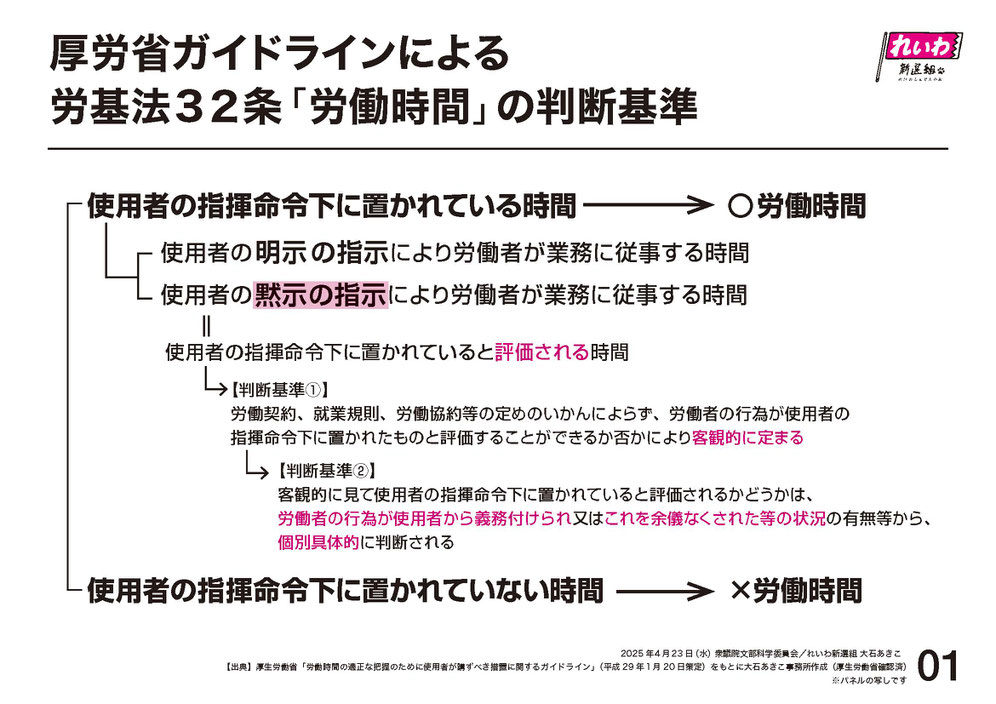 そうしないと、労働者というのは、往々にして、その使用者が、「これは労働時間じゃないんです、労働時間じゃない」と言って不払いにしていくということが実際に起きるものですから、だから、厚労省がガイドラインを定めて労基法32条の労働時間の判断基準を示し、使用者は、このガイドラインに基づいて、労働時間なのに労働時間逃れをして不払いにするだとか、あるいは8時間以内労働という32条を守らないということを防ぐために厚労省がガイドラインを整備していますので、その判断基準を分かりやすいように01に示しました。