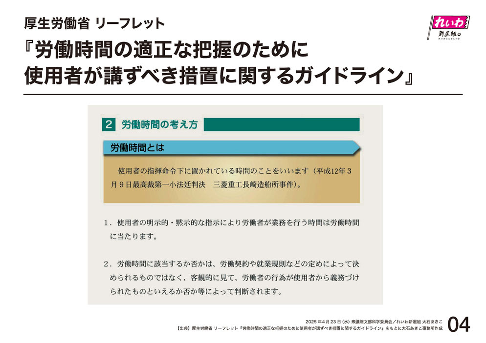 それを示すものが04ですね。厚労省自体がリーフレットに三菱重工長崎造船所事件を引用して、労働時間とはという定義の中にこの最高裁判例を示しており、その最高裁判例と整合した労基法32条のガイドラインにしている。