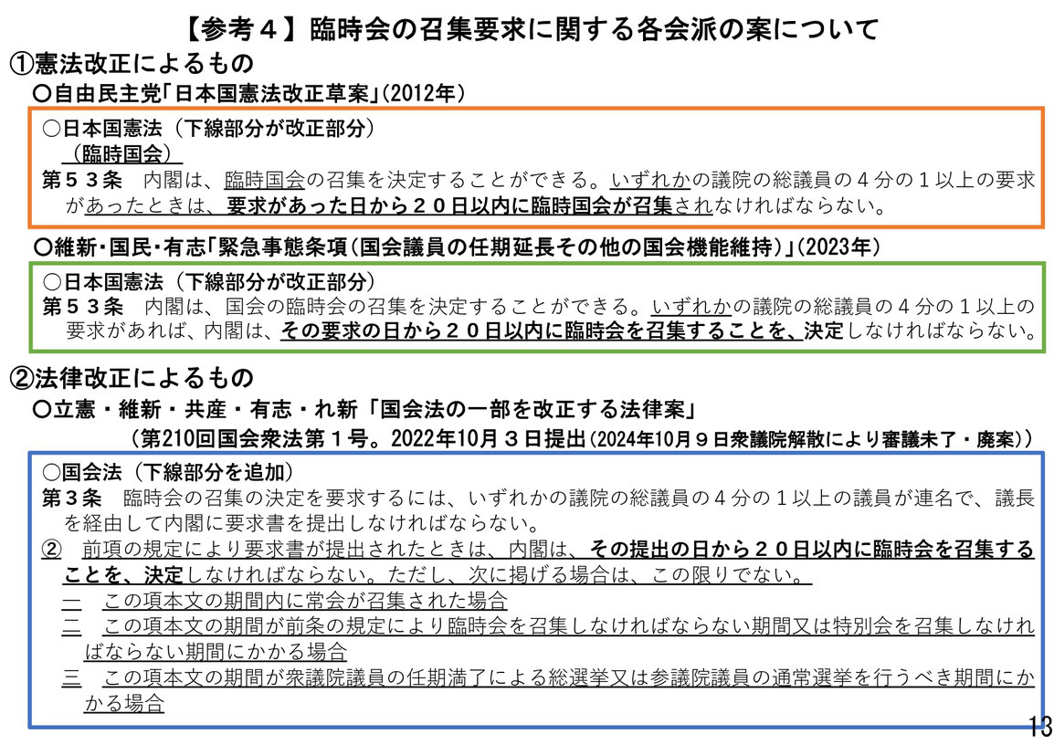 質問したいのは、これは法律改正のことで、法制局の資料でいうと13ページですけれども、れいわ新選組も含めて、さっさと法律改正をしてくださいと言っている。ほぼ、自民党、公明党を除いて、結局は、この部分、53条に基づいて、「要求の日から20 日以内に臨時国会を召集することを決定するべき」だというのは、この意見はほぼほぼ共通なわけで、2年ちょっと前にそういった法律案を提出して廃案となっているわけですけれども、これは今、与党は過半数割れですから、過半数いけば、さっさとこの法改正ができるわけなんですよね。