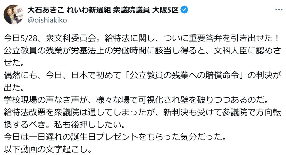 ですから、これは速やかに、当然許せるものではないので速やかに抜本的に、国が1兆円レベルの国費を措置して、抜本的に教員を増やさなければいけないんです。そして同時に、給特法の改正の議論で、給特法をまともに変えなければいけないんですよ。この不払い残業、ただ働きを解消するために、簡単なことだったんです、給特法の3条2項と、あと5条を変えて、労基法を守って残業代を払うことですね。