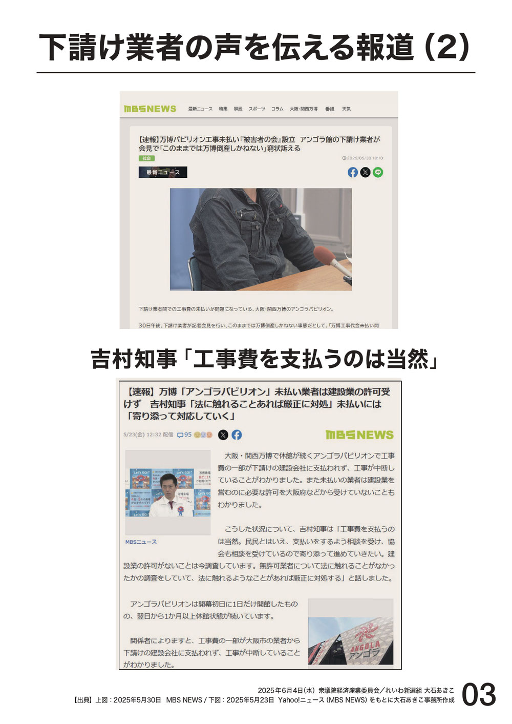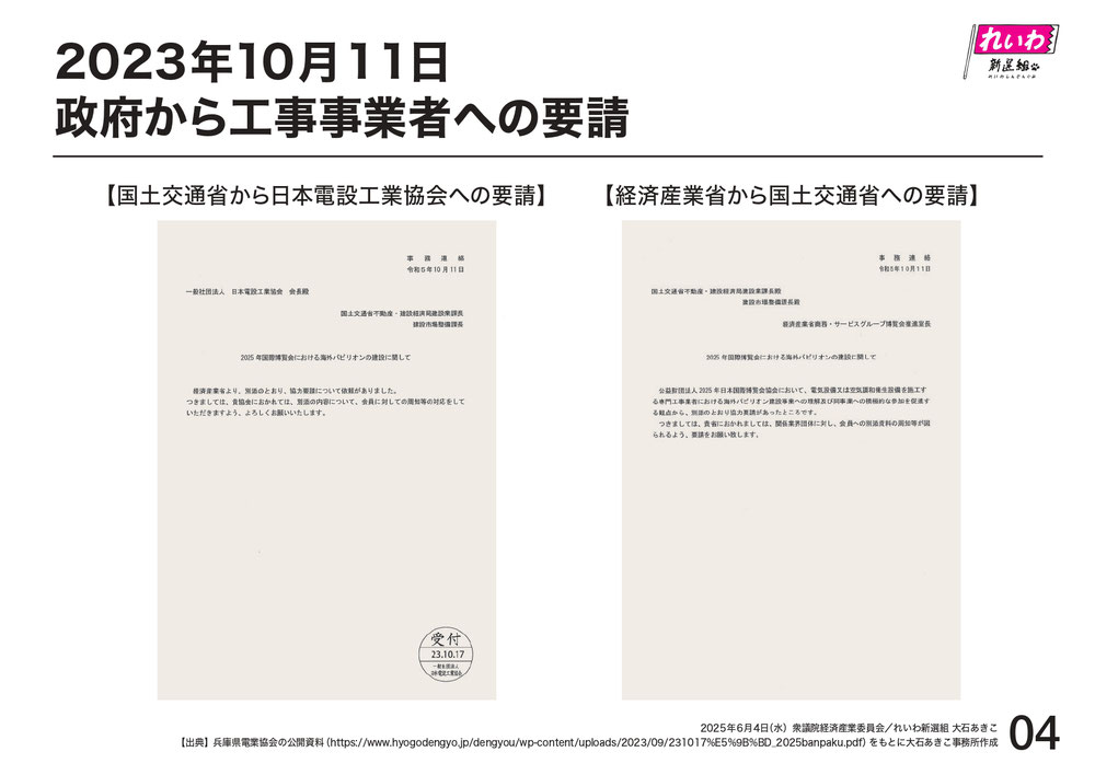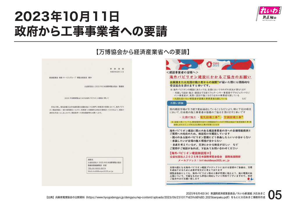 配付資料にもあります、4、5とか、政府から工事事業者への要請をしています。経産省から国交省に要請して、国交省から日本電設工事協会への要請をしたりとか、万博協会も、国に要請したり、あるいは、「建設事業者の皆様へ」といって、資料5の右下、カラー刷りのチラシの右下なんかは重大ですけれども、「万博の顔となる海外パビリオン建設プロジェクトにおける皆様の御参画は」、皆様というのは建設事業者ですね、「建設事業者の御参画は、万博を成功させるために必要不可欠だと考えております、万博協会としても、海外パビリオン等の工事が円滑に進むよう、施工環境の向上策について、可能なものから早急に対応していく所存でございますので、何とぞ御協力のほどお願いします」ということで、万博協会が、所管は経産大臣ですけれども、万博協会自らが施工環境の向上策について対応していくと明言する形で工事業者に呼びかけて、工事業者も国策やからということで応じて、落ちた資料ですけれども、4月にいろいろな夜間工事、24時間体制で数百万、また、全体でいったら4,000万と言われていますけれども、これは4,300万と報道されていますけれども、そのような未払いが生じているというのが現在であります。
