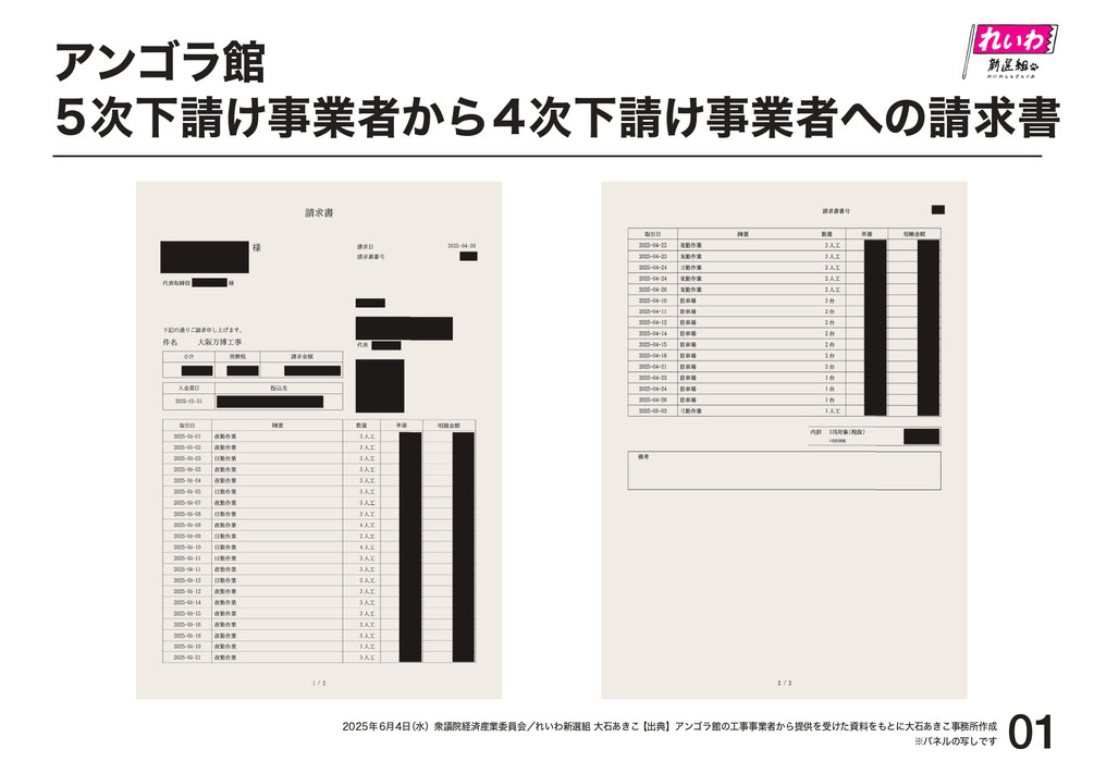 あと1枚の方が、この問題自体が5月半ばぐらいからテレビとか新聞とかで報道されるようになったんですけれども、その前に私が御相談いただいていたんですね。1社じゃなくて数件です。そのうちの一つの、4月にすごく突貫工事、24時間体制で、自分たちも、そして自分たちの下請にもすごく作業があったんだということを示す請求書ですね、それを、公益通報ですので、匿名性を保護してマスキングしたものを提示していたんですけれども、それがパネルで出所不明だという訳の分からない事情ではねられたということは、これは絶対に許せない。