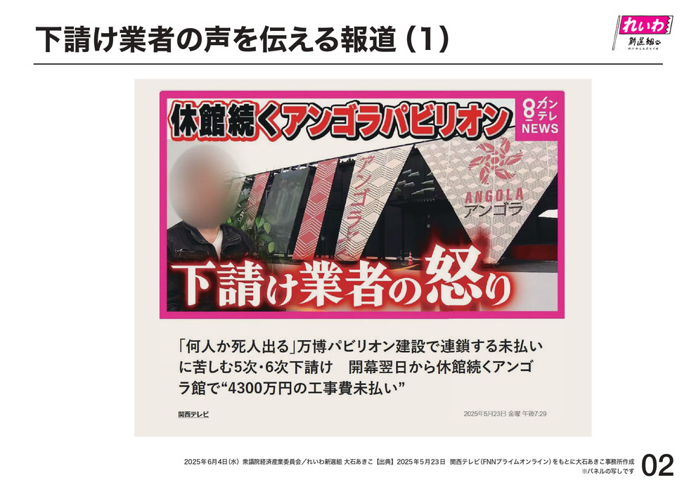 大石 重大なのは、万博倒産といって、この方々は倒産しかかっていて、非常に困っているんですよ。かつ、たまたま運が悪かったねとか、この問題だけではなくて、こういう施工看板がなかったというのはこのパビリオンだけではないと証言されているんですよ。