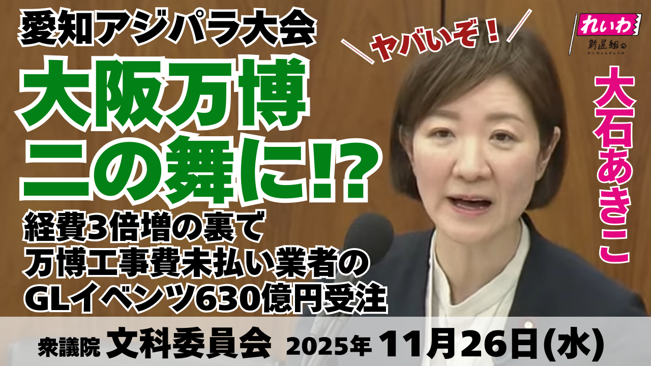 2025年11月26日【衆議院 文科委員会】愛知アジパラ大会大阪万博二の舞いに!?経費3倍増の裏で万博工事未払業者のGLイベンツ630億受注