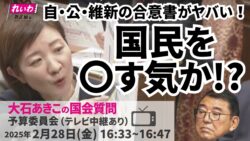 予算委員会2025年2月28日【予算委員会】自・公・維新の合意書がヤバい!国民を◯す気か!? 2025年2月28日【予算委員会】、社会保険料の引き下げ・教育無償化に関して、石破総理大臣に質問しました。※赤字はブログ掲載にあたっての補足です。====安住委員長 次に、大石あきこさん。大石れいわ新選組、大石あきこです。石破総理、昨日の裏... 2025.02.27予算委員会国会報告