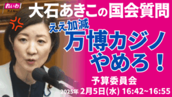 予算委員会2025年2月5日【予算委員会】ええ加減 万博カジノやめろ! 2025年2月5日【予算委員会】、万博カジノの問題に関して、伊東国務大臣に質問しました。====安住委員長 次に、大石あきこさん。大石れいわ新選組、大石あきこです。万博予算について。本日の午前中に、大阪府の吉村知事が石破総理に面会したんだと... 2025.02.05予算委員会国会報告