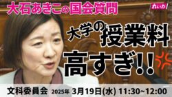 国会報告2025年3月19日【文科委員会】大学の授業料高すぎ! 2025年3月19日【文部科学委員会】修学支援法案に関して、あべ文科大臣に質問しました。※赤字はブログ掲載にあたっての補足です。====委員長 次に、大石あきこ君。大石れいわ新選組、大石あきこです。今回の修学支援法改正について、多子世帯の支... 2025.03.19国会報告文科委員会