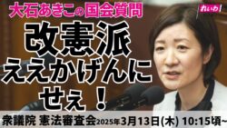 国会報告2025年3月13日【憲法審査会】改憲派 ええ加減にせぇ! 2025年3月13日【憲法審査会】選挙困難事態に関する立法事実について発言しました。※赤字はブログ掲載にあたっての補足です。====枝野会長 次に、大石あきこさん。大石れいわ新選組、大石あきこです。本日の意見表明に当たり、この数年の衆議院、... 2025.03.13国会報告憲法審査会