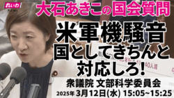 国会報告2025年3月12日【文科委員会】米軍機騒音、校則見直し 国としてきちんと対応しろ! 2025年3月12日【文部科学委員会】、沖縄の学校における米軍機騒音に関して、あべ文科大臣に質問しました。※赤字はブログ掲載にあたっての補足です。====中村委員長 次に、大石あきこ君。大石れいわ新選組、大石あきこです。先週3月8日に報道が... 2025.03.12国会報告文科委員会