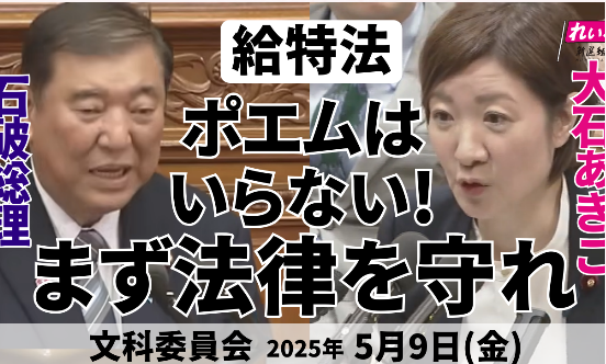国会報告2025年5月9日【大石あきこ・文科委員会】総理へ質問_給特法 ポエムはいらない!まず法律を守れ 2025年5月9日【文部科学委員会】給特法に関して、石破総理大臣に質問しました。00:00~ 対政府質疑「タブー直撃!大臣が対応不能に」16:28~ 対総理質疑「ポエムはいらない!まず法律を守れ」※赤字はブログ掲載にあたっての補足です。==... 2025.05.09国会報告文科委員会