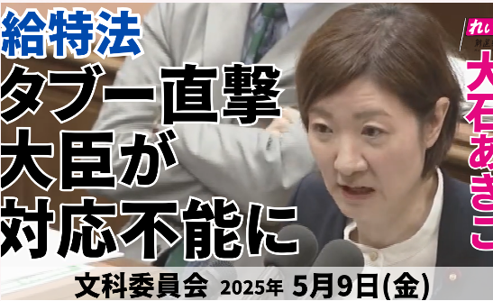 国会報告2025年5月9日【大石あきこ・文科委員会】給特法 タブー直撃 大臣が対応不能に 2025年5月9日【文部科学委員会】給特法に関して、あべ文科大臣に質問しました。00:00~ 対政府質疑「タブー直撃!大臣が対応不能に」16:28~ 対総理質疑「ポエムはいらない!まず法律を守れ」※赤字はブログ掲載にあたっての補足です。==... 2025.05.09国会報告文科委員会