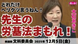 国会報告2025年12月5日【衆議院 文科委員会】どれだけヘリクツ言うねん!先生の労基法まもれ! 2025年12月5日【文科委員会】教員の休憩時間および学習指導要領について松本文科大臣に質問しました。青字でブログ掲載にあたっての補足を記載します。====委員長 次に、大石あきこ君。大石 れいわ新選組、大石あきこです。学校の先生に労基法が... 2025.12.08国会報告文科委員会