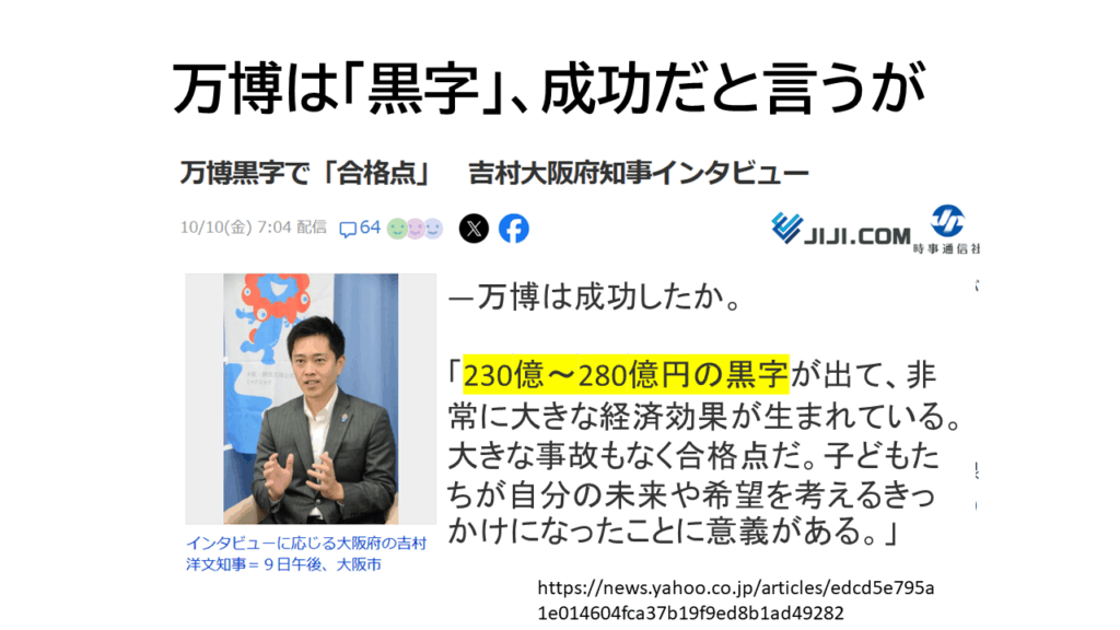 これは10月10日の記事ですけれども、万博黒字で「合格点」 吉村大阪府知事インタビューという記事です。
