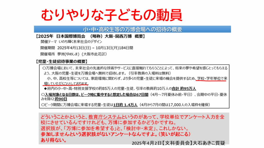 どういうことかというと、教育庁システムというのがあって、学校単位でアンケート入力を全校にさせているんですけれども、万博に参加するかどうかですね。