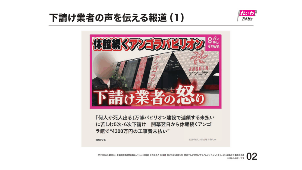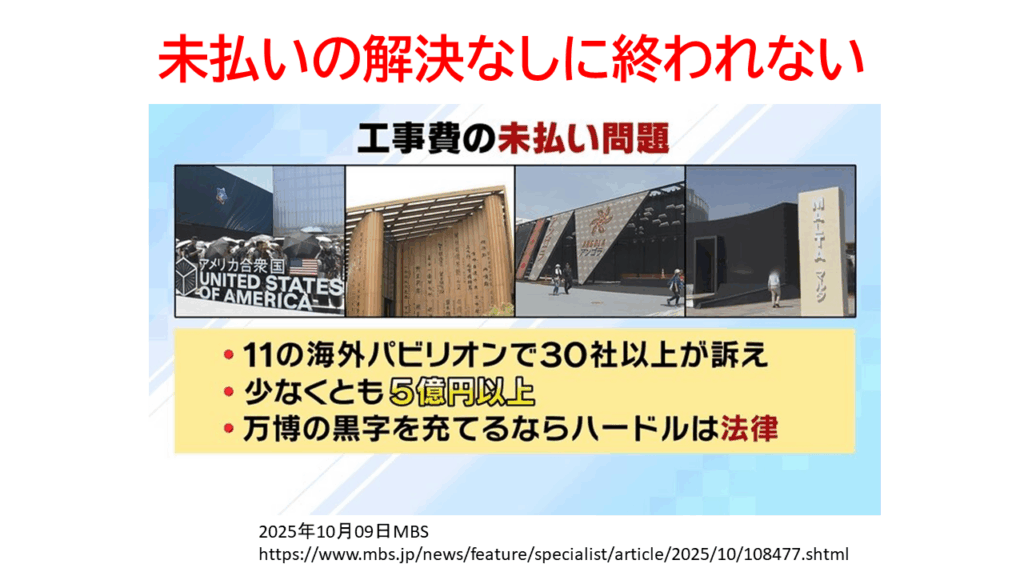 さらに、万博のパビリオン工事業者への未払い問題です。