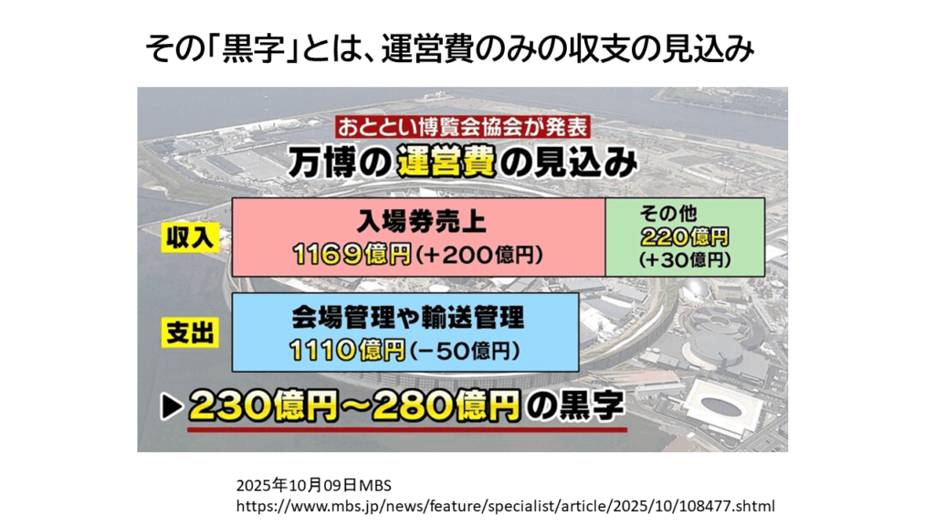 黒字運営費のみの収支の見込みを、このような棒グラフで、出しています。収入が、万博の運営費の見込みとして、チケットの売上が1,169億円。思ってたより200億円プラスであったと。で、その他の収入ってのが 例えばグッズの売上とかです。これも思ったより30億円プラスであったと。だから、プラスになった。