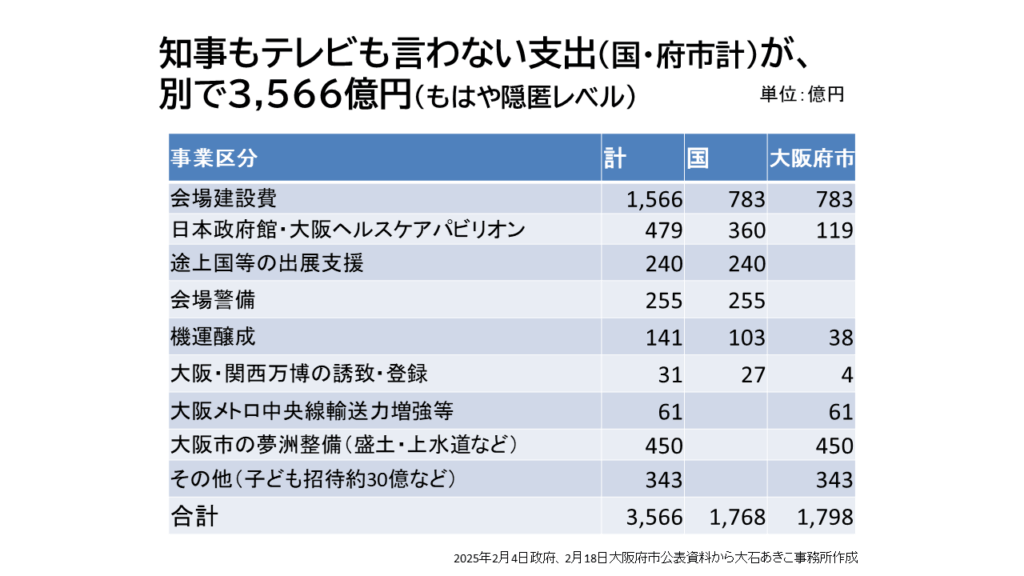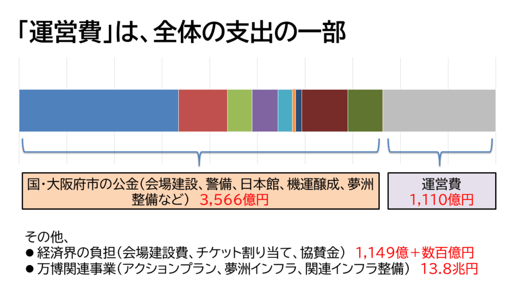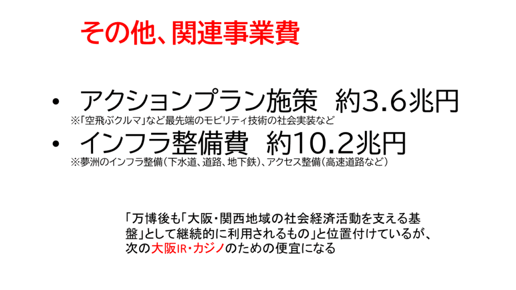 他にも本来入れるべきものが あります。経済会の負担で、数百、数千億円相当とそもそも万博関連事業として積んでるインフラ整備の周辺ものも全部入れたら13兆円というものにもなります(このインフラ整備は、次のIR・カジノ整備への便宜になっています)。
