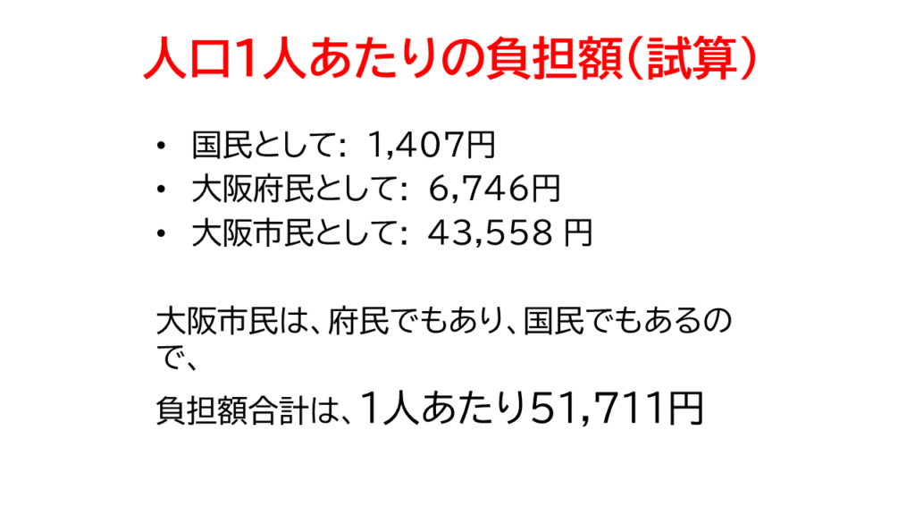 え、大阪市民えらい負担でかいやないかと。え、大阪市民は府民でもあり国民でもありますので、足し合わせますと負担額合計は1人あたり5万1,711円。