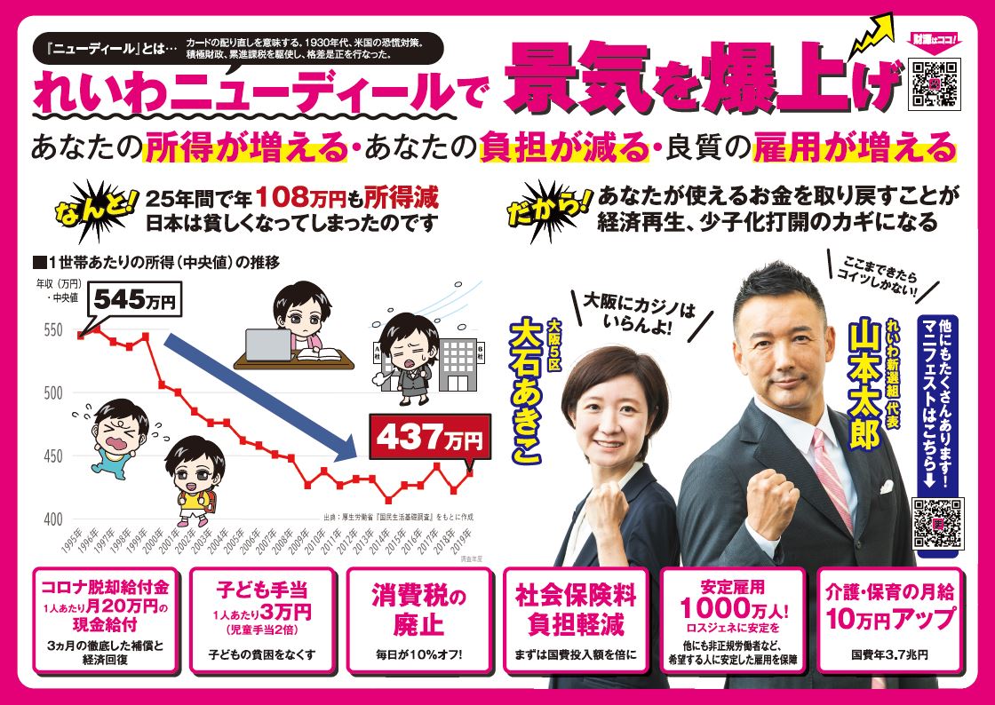 なんと!25年間で年108万円も所得減。日本は貧しくなってしまったのです。  だから!あなたが使えるお金を取り戻すことが、経済再生、少子化打開のカギになる。  コロナ脱却給付金1人あたり月20万円の現金給付 子ども手当1人あたり3万円(児童手当2倍) 消費税の廃止 社会保険料負担軽減(まずは国費投入額を倍に) 安定雇用1000万人(ロスジェネに安定を) 介護・保育の月給10万円アップ 大阪にカジノはいらんよ!