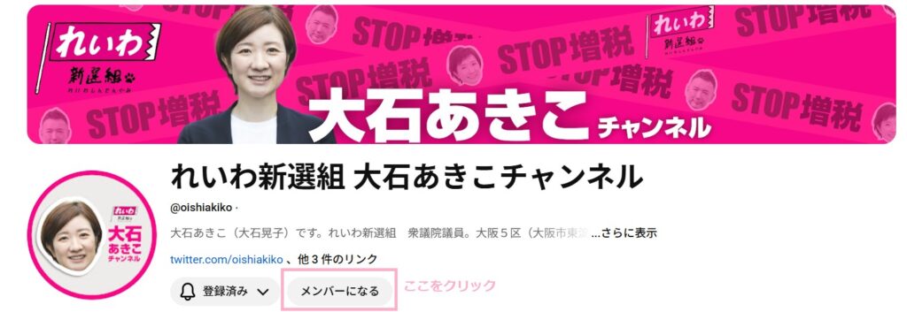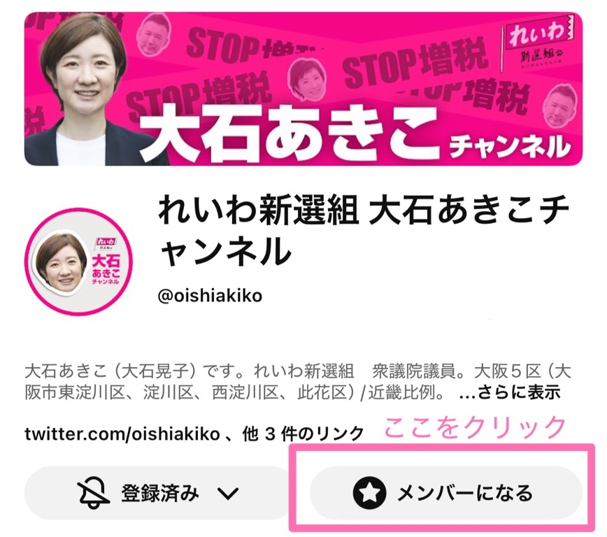 A.safariの検索欄で「YouTube」と検索→検索結果のYouTubeのサイトを長押し→「開く」を押す→YouTubeサイト上の検索欄に「大石あきこ」を入力し🔍マークを押す→大石あきこ公式YouTubeチャンネルのアイコンを押す→チャンネル登録の横の「メンバーになる」を押す→「¥490/月」になっていることを確認の上、「メンバーになる」を押す。これで完了です。